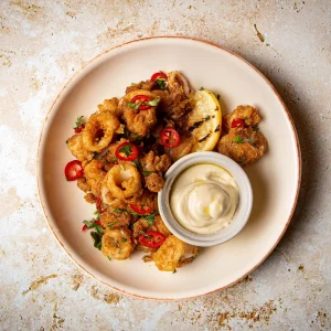Lightly coated squid with garlic aioli & sliced chilli